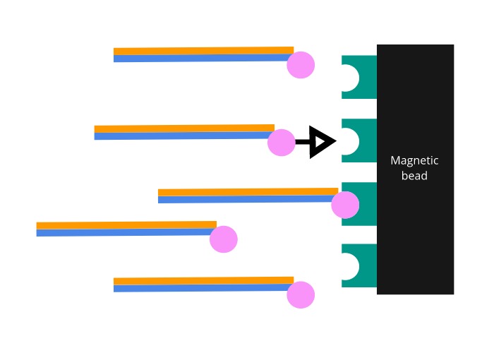 The probes are manufactured to include a biotin molecule on one end. Biotin is a molecule that binds to a protein called streptavidin with one of the strongest interactions known to biology. Magnetic beads coated in streptavidin are then added to the mixture. Once the coated beads are firmly bound to the biotinylated probes, a magnet is used to pull the bound exome DNA out of solution.