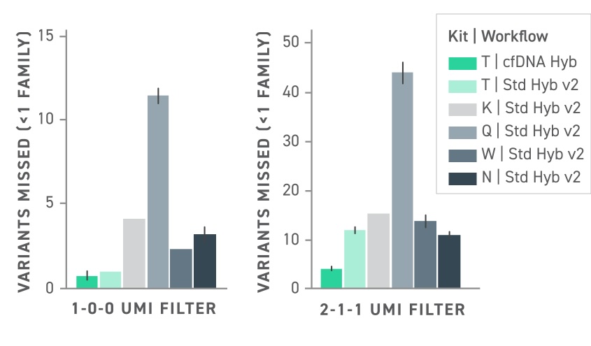 This is emphasized when attempting to detect low-frequency variants in cell free DNA (Figure 2). Whether using duplex sequencing or not, the Twist cfDNA Library Preparation Kit outperforms competitors by a wide margin, demonstrating very few missed variants.