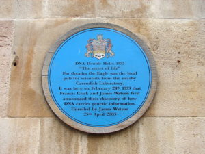 Plaque at The Eagle Pub in Cambridge, UK commemorating the first public announcement of the double helix structure of DNA. (Source: Wikicommons, Author: Simon Harriyott)
