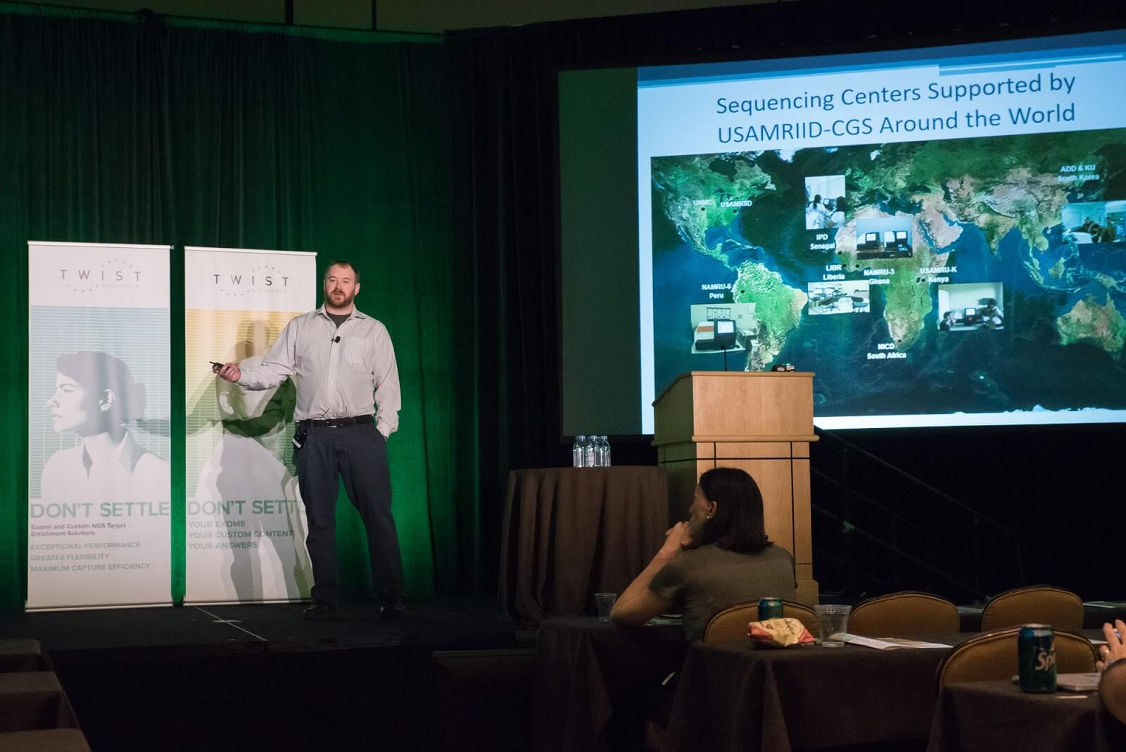 Michael Wiley, Ph.D., Microbiologist with the U.S. Army Medical Research Institute of Infectious Diseases (USAMRIID), Center for Genome Sciences, demonstrated data using Twist Bioscience double-stranded DNA capture probes to enhance viral whole-genome sequencing (WGS) in a talk titled, ‘Using TruSeq RNA Exome with Twist Bioscience Probes to Enhance Viral Whole-Genome Sequencing.’