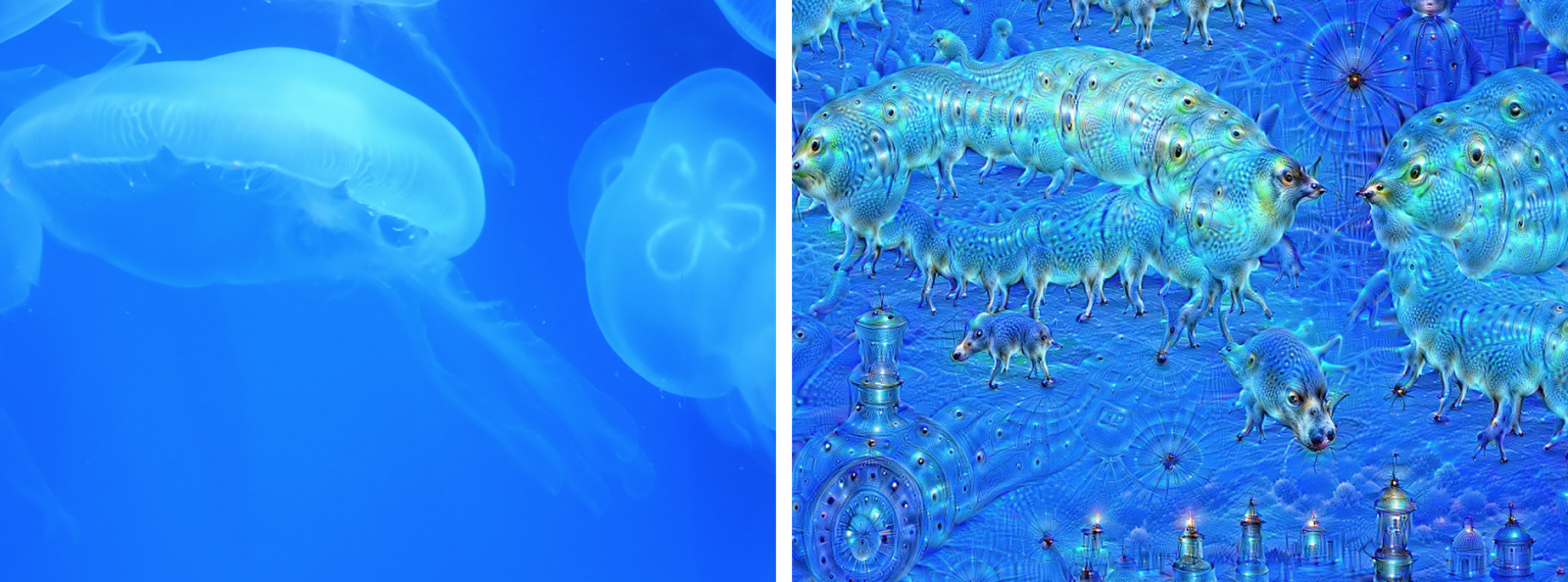 Google engineer Alexander Mordvinstev’s deep dream algorithm: Machine learning is used to teach a computer about a given set of images, and the computer will then find and enhance any parts of these images it finds in any photo, creating psychedelic digital art. Left is an image of jellyfish, right is the same image enhanced by deep dream algorithm trained with images of animals and buildings. Source: Wikicommons. Author: MartinThoma