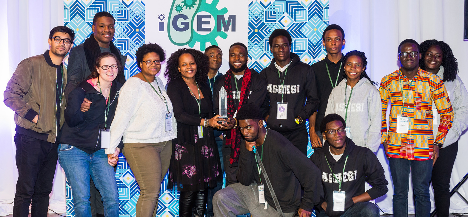 Ashesi ghana with their award. Source: Flickr. Attribution: iGEM foundation and Justin Knight. Image edited from original (cropped). Image licensed under CC by 2.0.