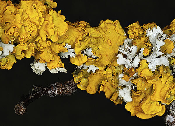 Lichens are unusual organisms that exist as a symbiosis between a cyanobacterial species and a moss species, neither of which can survive without the other. They are the yellow blobs you see growing on rocks and trees, and are a vital part of the forest soil ecosystem. Lichens grow in tight, carpet-like layers, forming their own micro-niches that are hardy enough to grow where nothing else can.