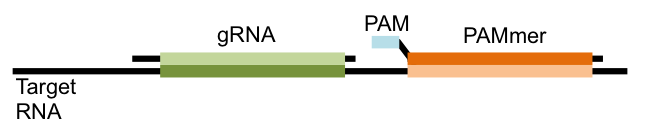 Previous studies showed that in the test tube Cas9 could target RNA sequences if another guiding RNA sequence, called a PAMmer, was also used alongside the gRNA. This PAMmer is complimentary to the RNA sequence that is next to the sequence recognized by the gRNA. It also contains a component called a protospacer adjacent motif (PAM) that is essential for Cas9 to make its cut (see Figure).