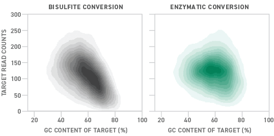 NEB recently pioneered an enzymatic alternative to the conventional bisulfite conversion process. Called enzymatic methyl-seq (EM-seq™), the new methyl-seq library preparation method uses a series of enzymes to convert DNA samples for methylation detection. Compared to bisulfite-converted libraries, those prepared enzymatically show more uniform coverage across a variety of GC contents. This translates into a 15% higher detection rate for EM-seq than bisulfite conversion.