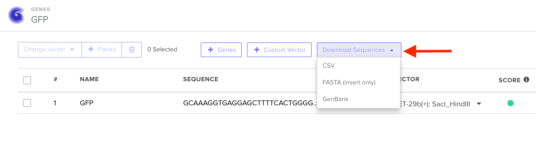 “Download sequences” button on drafts page will give you insert, vector, and final construct sequence details for your whole order.