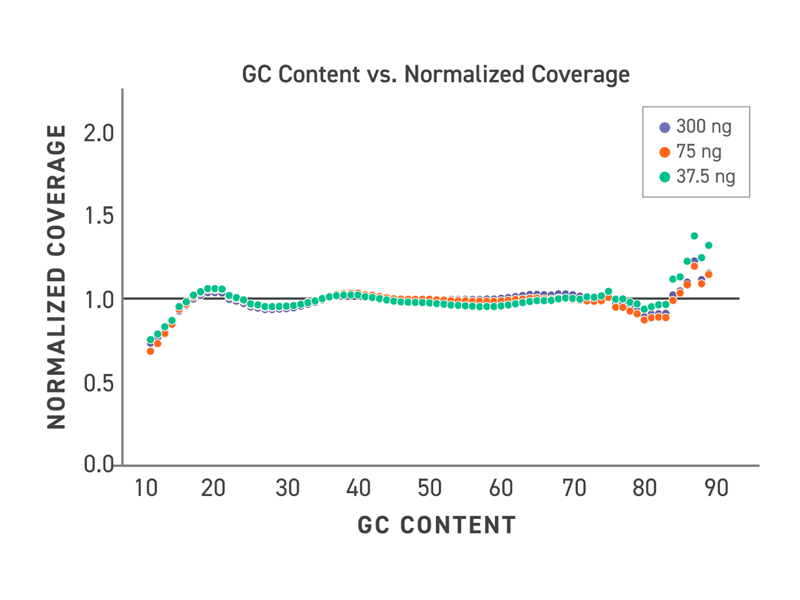 Figure 4. The Twist PCR-Free WGS Library Preparation Kit provides more consistent coverage distribution across varying GC content. The kit shows minimized GC bias even at low inputs, thereby reducing the need for additional sequencing to achieve uniform coverage and better detection of variants in the high- and low-GC content regions.
