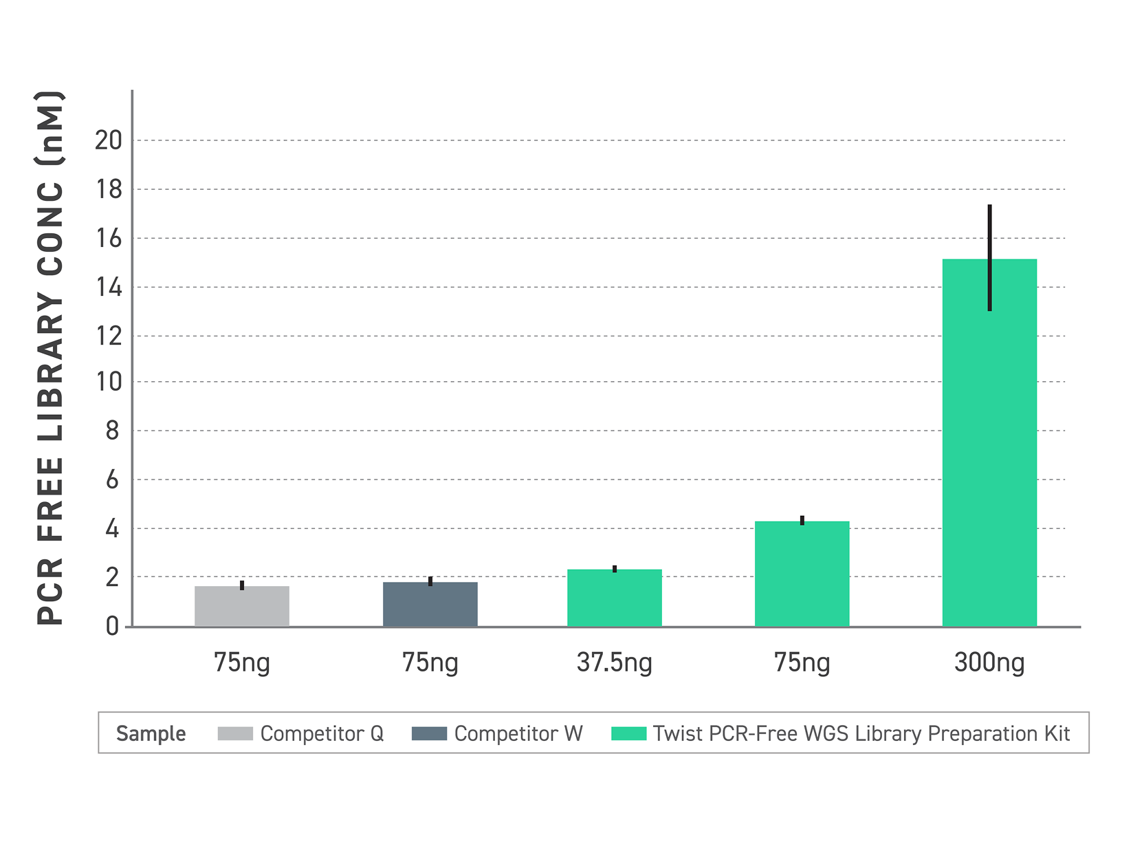 Figure 1. PCR-free library yield comparison across inputs. Final library concentration (nM) was measured following PCR-free library preparation using the indicated DNA inputs. Twist PCR-Free WGS Library Preparation generated higher library yields than competitor workflows at equivalent inputs and maintained strong performance at lower inputs.