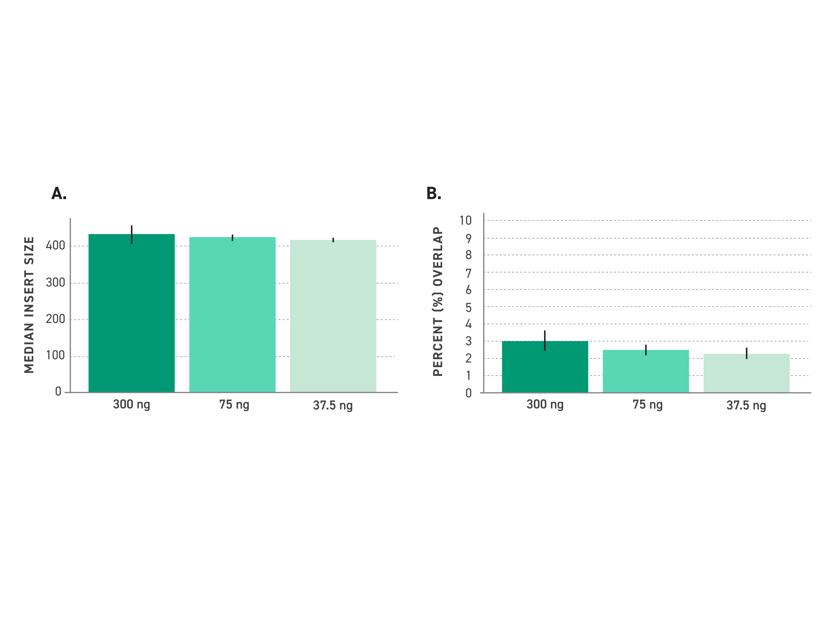 Figure 2. The kit produces consistently large inserts across a wide range of DNA samples. (A)Median Insert Size is represented for 300 ng, 75 ng, and 37.5 ng of NA12878 DNA sample input. (B) Percent Overlap (which measures how much paired-end sequencing reads redundantly cover the same DNA bases) is represented for 300 ng, 75 ng, and 37.5 ng of NA12878 sample input.