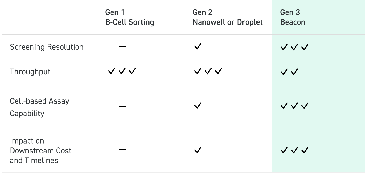 We do that. The Beacon-based B cell screening enables high-resolution screening for ideal, rare antibodies in previously impossible timelines.