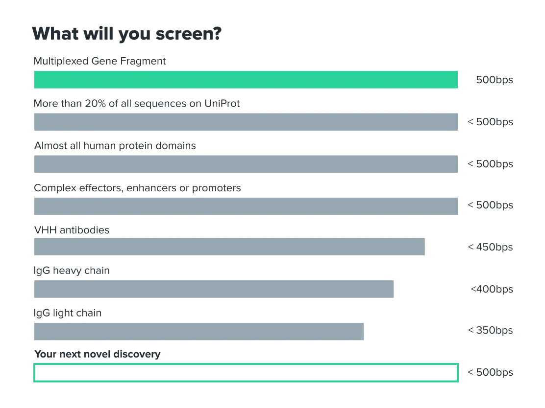 This first-of-its-kind product offers high throughput pooled synthesis of gene-length sequences up to 500 bp. Screen with unprecedented sequence real estate, for a fraction of the cost of screens built with traditional gene synthesis.