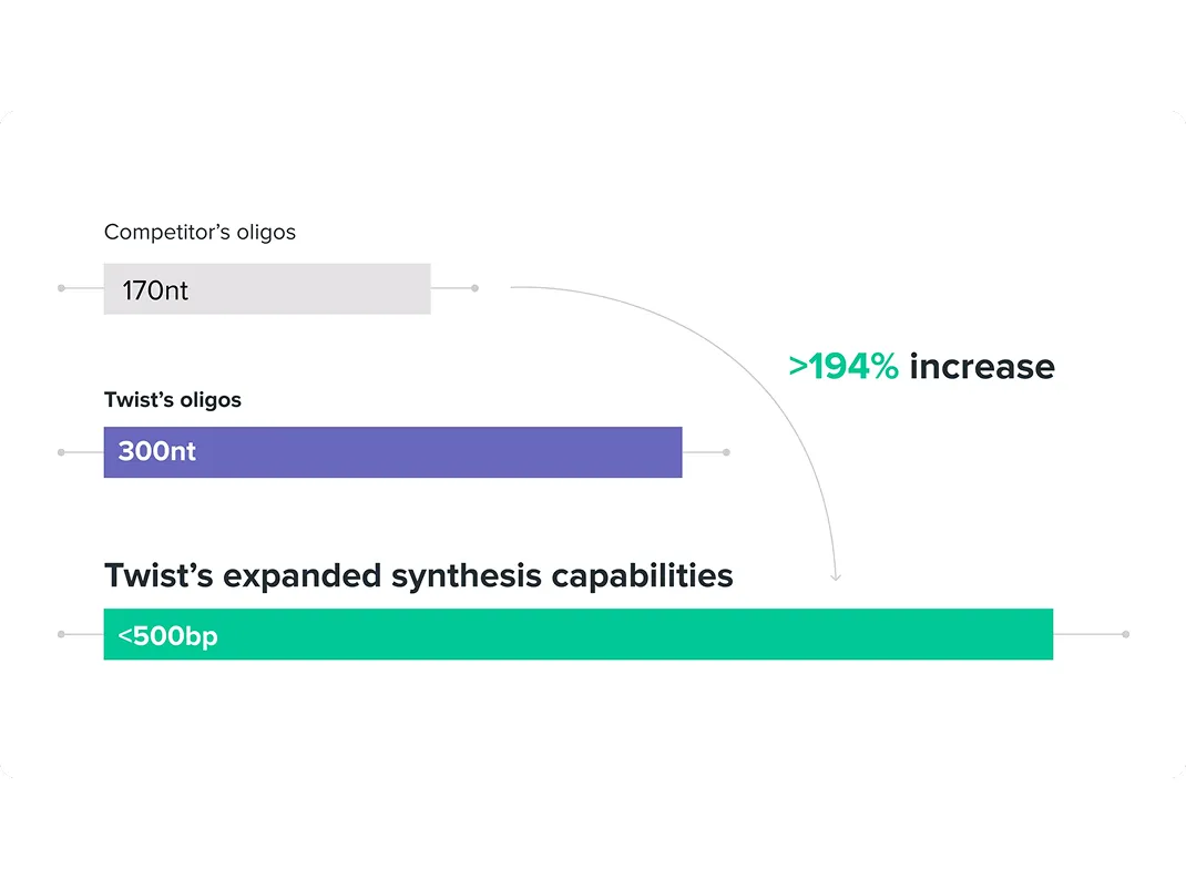 Twist Multiplexed Gene Fragments are produced from DNA synthesized at lengths of up to 500 nucleotides, GenScript GenTitan Oligo Pools max out at 170nt.