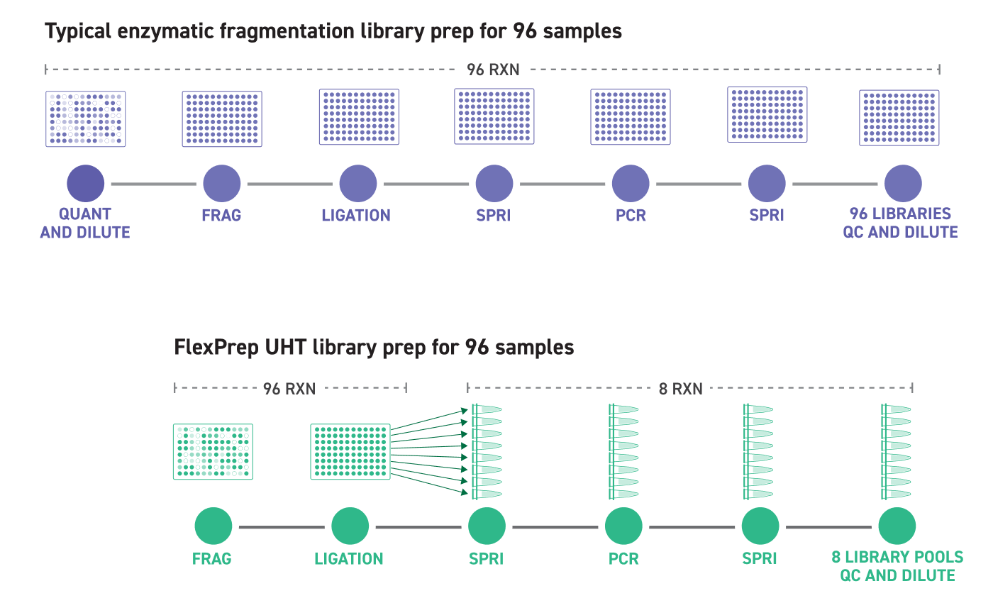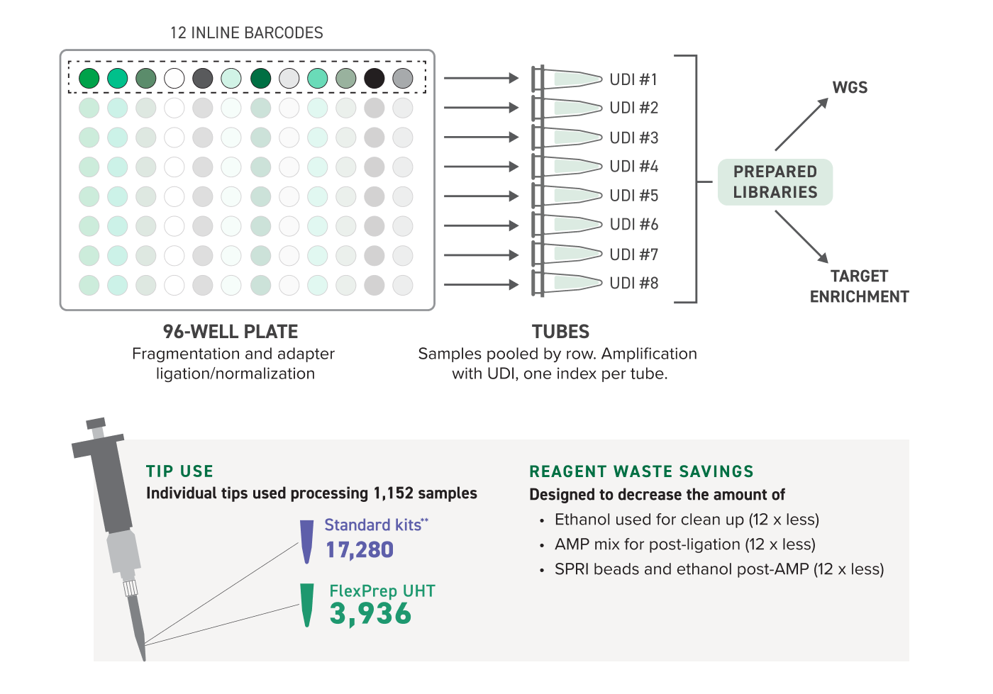 Fragmentation and ligation reactions are prepared in one well per sample. The adapters used during ligation contain inline barcodes that allow for the pooling of all 12 wells in a row of a 96-well plate. Individual pools are prepared with indices (UDIs) added by PCR for pool-level demultiplexing. Sequencing throughput can be maximized by running up to 1,152 samples in a single sequencing run from one FlexPrep kit. This increased efficiency can translate to cost and consumables savings.