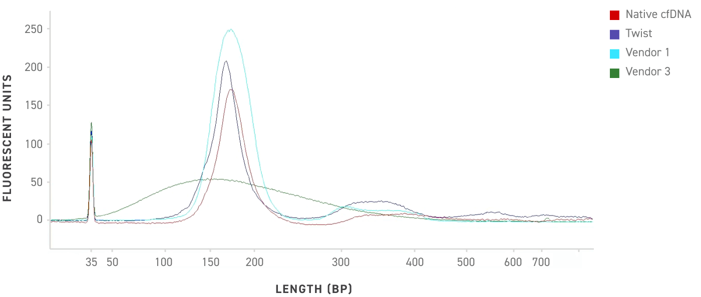 DNA fragment analysis of the Twist cfDNA Pan-cancer Reference Standard v2, native cfDNA and competitor reference standards equalized for peak maximum height. Twist standards have a size distribution that emulates native cfDNA including a prominent mononucleosomal peak and dinucleosomal peak.